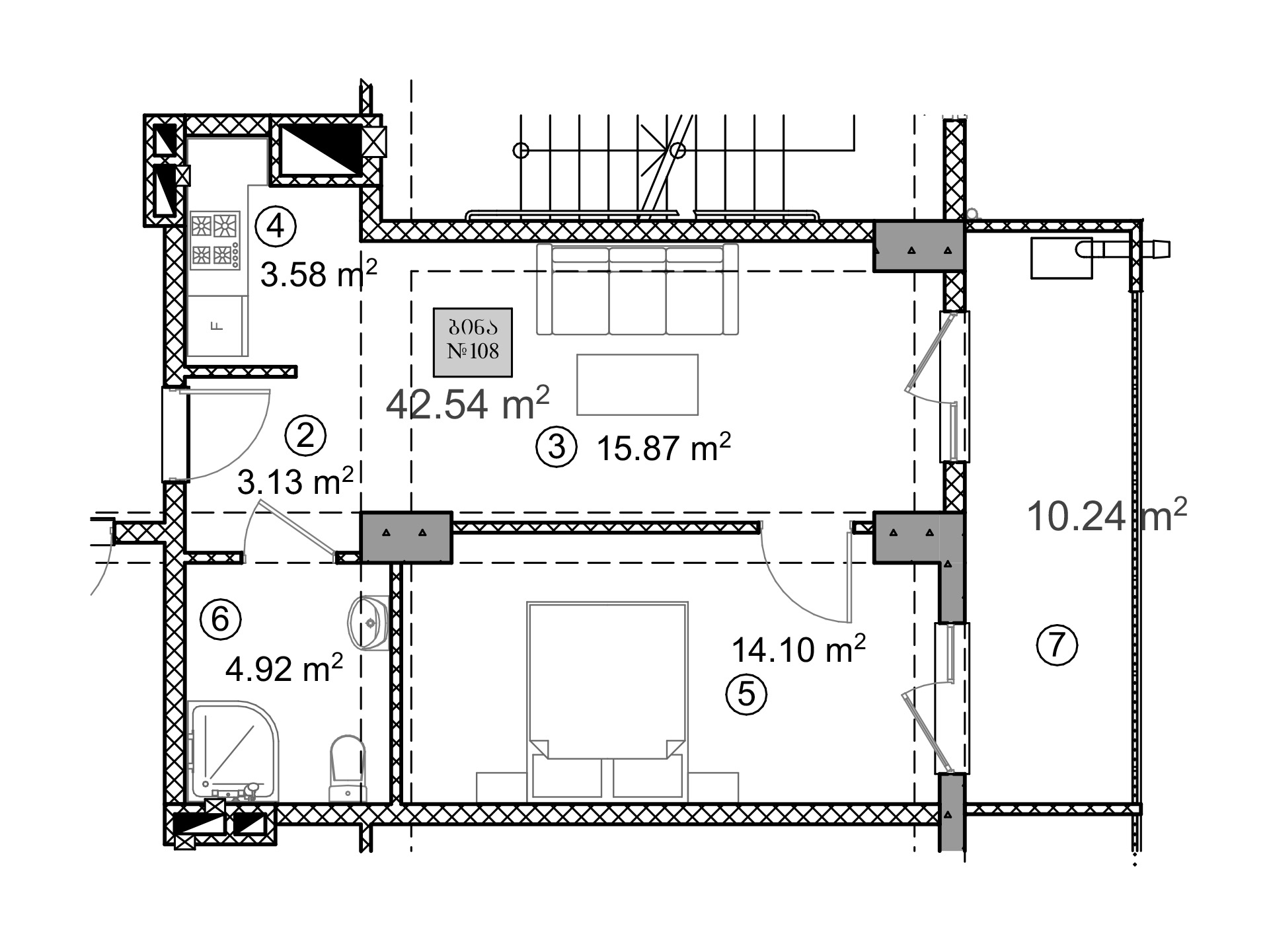 - საცხოვრებელი ფართი : 42.54 კვ.მ